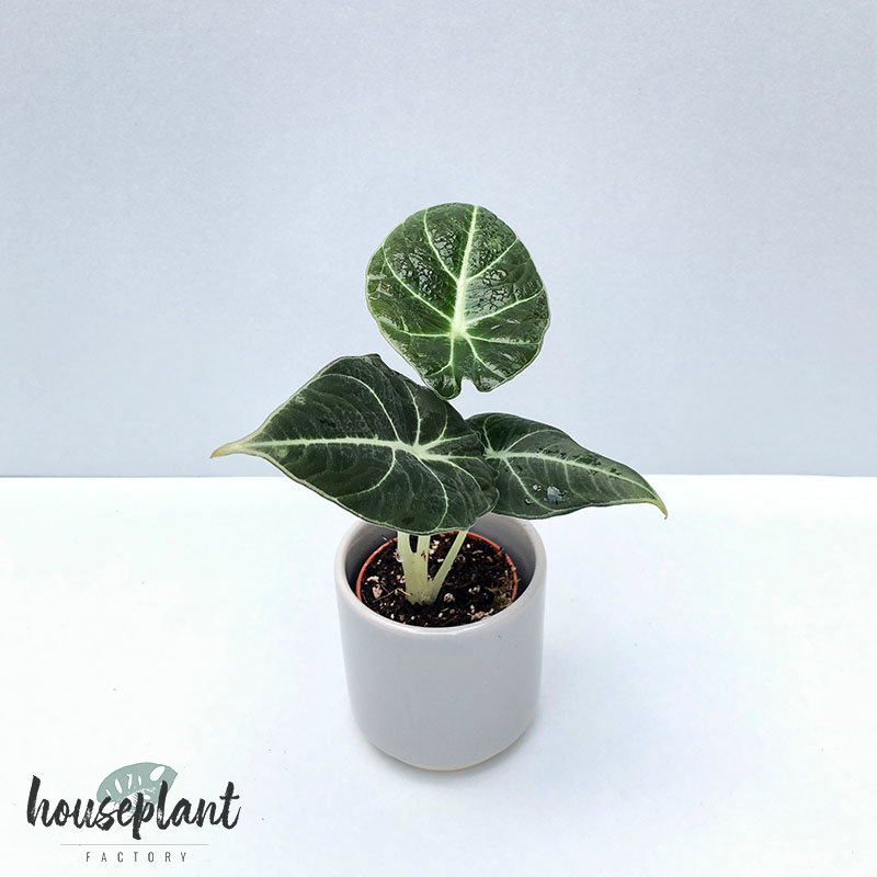 Alocasia Black Velvet babyplant in 5cm pot. Ideal for growing yourself, can be cultivated in the terrarium or on the windowsill. Should be kept moist, not wet. No direct sun.