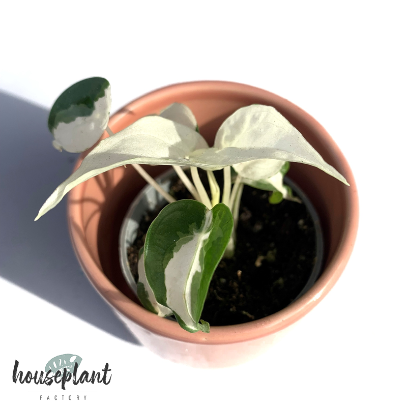 Beautiful, white variegated Alocasia in a 6cm pot. You will receive a fully rooted plant
