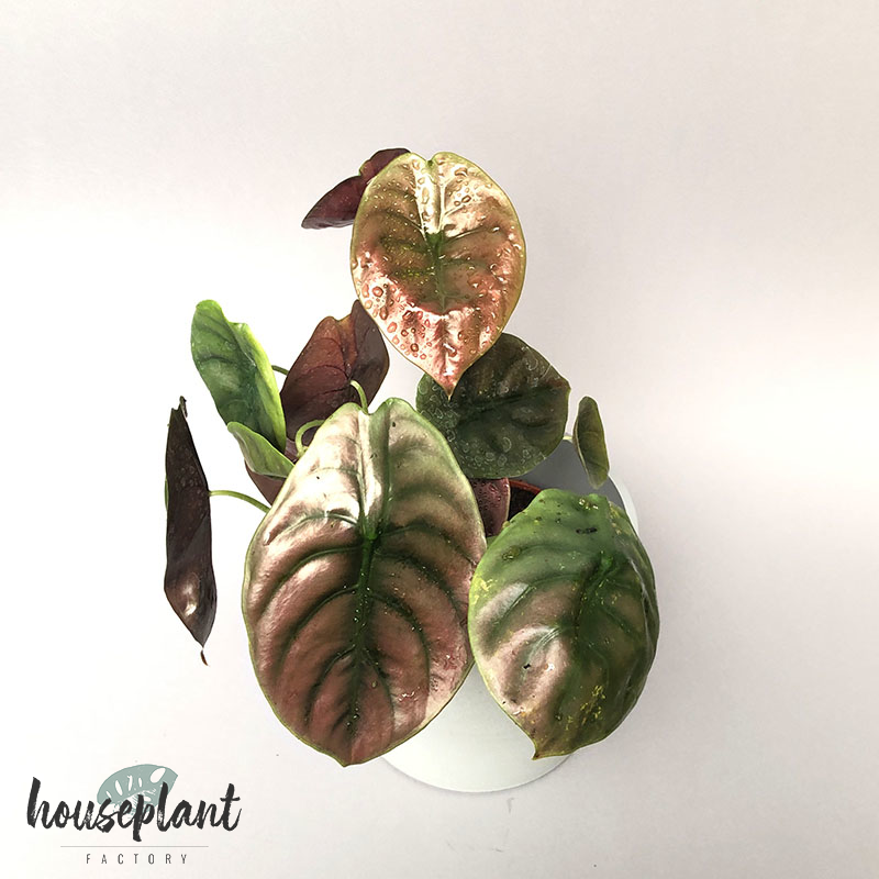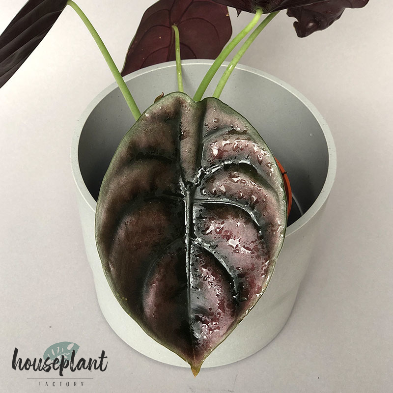 Die rot-schwarzen Blätter dieser Alocasia schimmern auffallend metallisch und machen diese seltene Pflanze daher zu einem Must Have für viele Pflanzenliebhaber. Ihr kupferner Glanz verlieh der Pflanze, die ein wenig mehr Aufmerksamkeit bei der Pflege benötigt, den wissenschaftlichen Namen Alocasia cuprea.