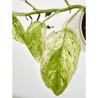 Die Panaschierung dieser seltenen Epipremnum mit ihren grünen Sprenkeln auf den weißen Blättern macht die Pflanze zu einem aparten Blickfang. Die Panaschierung prägt sich je nach Standort unterschiedlich stark aus, direktes Sonnelicht sollte jedoch vermieden werden. Die Epipremnum pinnatum green variegata lässt sich in einer Hängeampel halten oder kann an Kletterhilfen emporranken und ist nicht kompliziert zu pflegen.