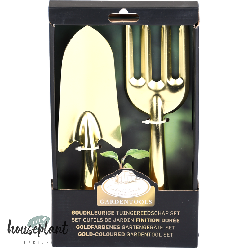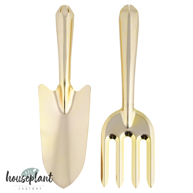 Goldene Gartengeräte aus Carbonstahl - optimal zum Umtopfen im eigenen Zuhause. In schöner Verpackung ein perfektes Weihnachtsgeschenk für jeden Pflanzenliebhaber.