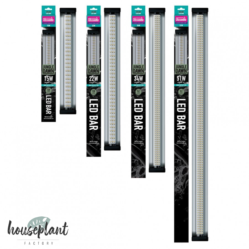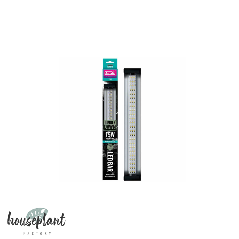 Unter Verwendung einer speziell entwickelten Mischung aus Vollspektrum-LEDs mit hoher Leistung hat Arcadia eine LED bar geschaffen, welche eine große Lichtmenge mit einem sehr hohen PAR-Wert projizieren kann. Die Jungle Dawn LED Bar projiziert ein volles Lichtspektrum, welches sichtbares natürliches Sonnenlicht (6200 Kelvin) nachahmt.