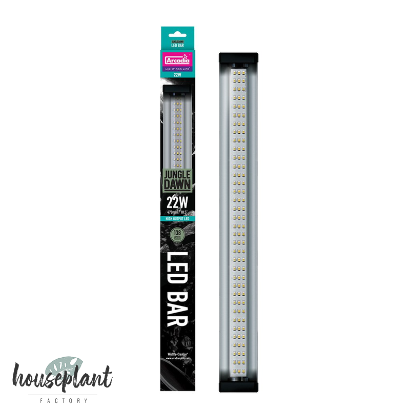 Unter Verwendung einer speziell entwickelten Mischung aus Vollspektrum-LEDs mit hoher Leistung hat Arcadia eine LED bar geschaffen, welche eine große Lichtmenge mit einem sehr hohen PAR-Wert projizieren kann. Die Jungle Dawn LED Bar projiziert ein volles Lichtspektrum, welches sichtbares natürliches Sonnenlicht (6200 Kelvin) nachahmt.