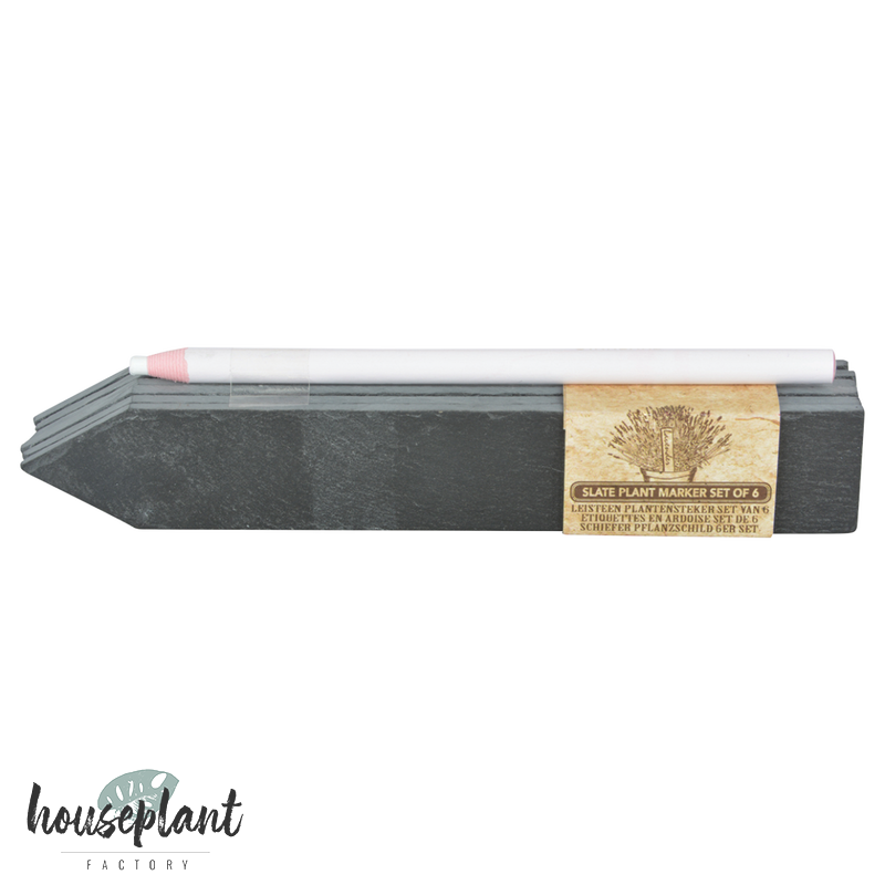 Auf diesen sechs Schiefer- Pflanzschildern können die Namen der jeweiligen Pflanzenarten notiert werden. Beschriften Sie die Schilder mit dem mitgelieferten weißen, wasserfesten Wachsstift.